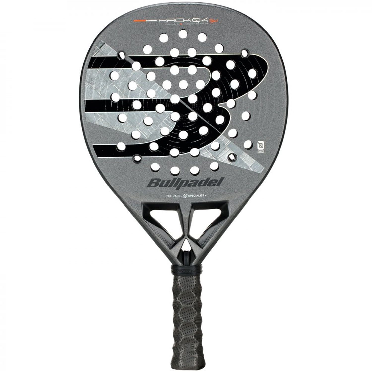 The hole pattern on a padel racket plays an important role in performance, influencing factors such as control, ball output, and power. The new hole pattern in the Hack 04 line has been redesigned with a concentric circle format, allowing for a more balanced distribution, greater flexibility across the racket face, and thus greater ball output and a larger sweet spot.